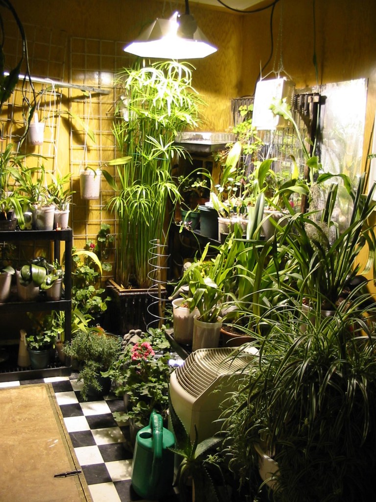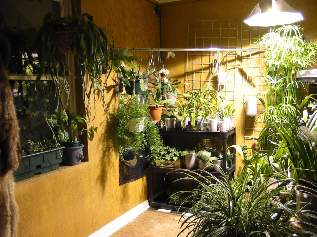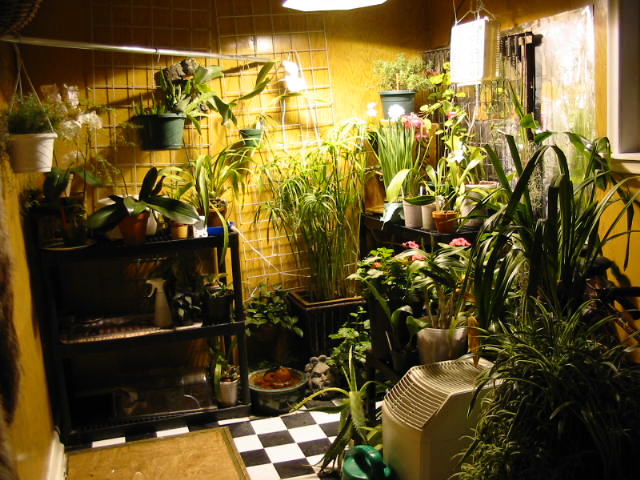 I live on the 3rd floor of an apartment in downtown Toronto, and I make do. My garden comes equipped with a 1000watt full-spectrum light bulb, a humidifier, a fan, all tucked into a beautifully landscaped mudroom. Assorted orchids, ivy, ephiphyllums, geraniums, oddball tropicals and a giant spider plant compete for space with a couple of bikes and a cat litterbox, as well as the odd tied-off garbage bag lobbed in from the vicinity of the kitchen.