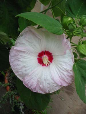 I couldn’t resist buying this monster-sized hibiscus at the corner flower and fruit stand yesterday — only $14. But then, it was in a ridiculously small peat pot, so I bought a big clay one for $20, and a some annuals to fill in around the base for another $7. I guess it wasn’t THAT much of a deal. But still, the flowers are stunning, about 8 inches across, and the plant is loaded with buds.