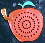 I pulled the camera out tonight, and took a picture of the worm composter. Some recommend that holes be drilled in the bottom of plastic containers so that the liquid from the decomposing waste can drain out, preferably on to a tray and not the floor (the liquid makes a good manure tea). Otherwise, the liquid can make for uncomfortable worms in soggy bedding, and the contents can become stinky because of the anaerobic conditions. It’s also suggested that air vents be drilled 2 inches up from the bottom as well as at the top, for cross-ventilation. This model has neither, though the top air vents are decorated with a cute red apple and worm.