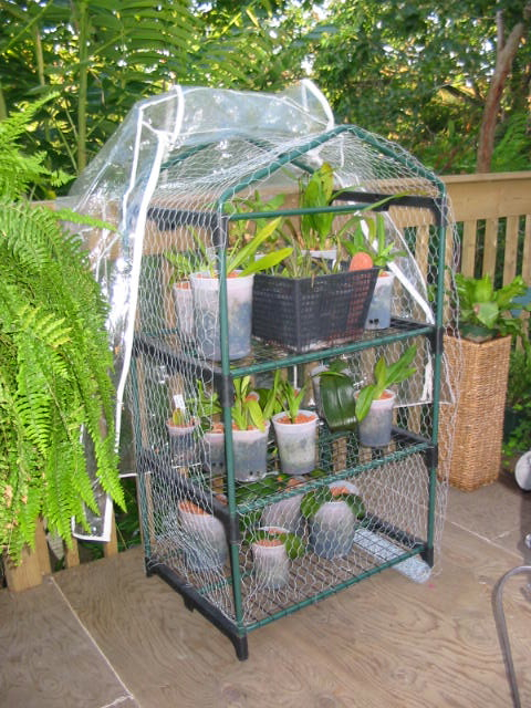 Finally, a picture of the racoon fortifications around my orchid stand. I wrapped what’s left of the tattered cover over top of the chicken wire each night. I have the satisfaction of knowing that I am finally frustrating the old fatso, because each morning there’s a big dent in the top of the chicken wire where he’s tried in vain to break through.