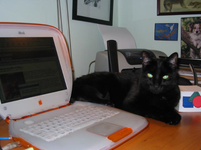 This has been “his” spot since the day I brought him home as a wee little kitten. On the days I’m not annoyed with him for getting in my way, I think it’s kind of endearing. His usual routine is to jump on the desk and walk back and forth in front of the computer a couple of times, waving his tail in my face as I shove him aside. He eventually settles down on top of the mouse (like a bird on an egg), and reaches out with a paw to touch me. Every time I move my arm, his paw snakes out to find it and make contact again. I have to fight with the cursor on the screen every time he moves. It can’t be comfortable lying on top of that mouse.