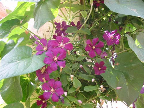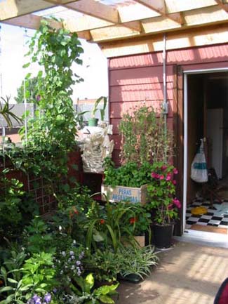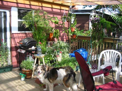 In the centre, a white climbing rose, a clematis, and morning glory are battling for air rights. Morning glory seems to be winning. To the right, a jungle of herbs, Johnny Jump-Up, tuberous begonia, sweet peas, some sweet potato vine (thanks to a couple of sprouting tubers that never quite made it to the dinner plate), and assorted houseplants fill the space.