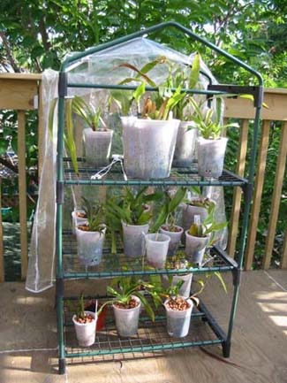 My $20 flea market find (a “greenhouse” sold by Lee Valley Tools for $60) has been put to good use as a secure, zipped up anti-racoon security zone at night. None of my orchids are doing well after a traumatic spring of cold weather and racoon vandalism, but there is new growth and I’d say they’re making a comeback.