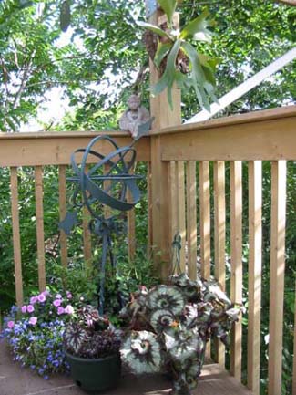 English ivy is starting to climb up the sundial, surrounded by some interesting Begonia Rex plants that I brought home from Vancouver, as well as some ferns, and double pink impatiens. Hanging above is a staghorn fern that has doubled in size since last year, and is thriving in the humid weather.