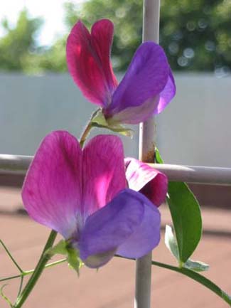 Knee-high sweet peas suffered a bit during my two week vacation, but seem to be making a comeback. Wave petunias cascade over the side of the railing.