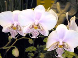 Back to Phals. There is a reason they are popular with beginners — they can be hard to kill. They like warm rooms and a bright spot sheltered from direct sun — an east window is perfect. Like most orchids, they like lots of humidity, but unlike many orchids, they can adjust to the drier conditions of central heating. They are “epiphytes” — a sure-fire way to kill them is to plant them in soil like an ordinary houseplant. In the wild, they grow on trees in tropical rain forests. In the home, they’ll be happy in a medium that keeps their roots moist but also gives them lots and lots of oxygen. I’ve seen them grown in spagnum moss or in a bark mix prepared specially for orchids. I grow mine in leca — little clay balls that you can buy at a hydroponics store. In fact, the method I use is called “semi-hydroponics”. I can never seem to get the watering just right so this method is perfect for me. You can read up on it at the First Ray’s Orchids Web site. Ray is the fellow who developed this method of growing orchids — he’s a very decent fellow and very helpful.